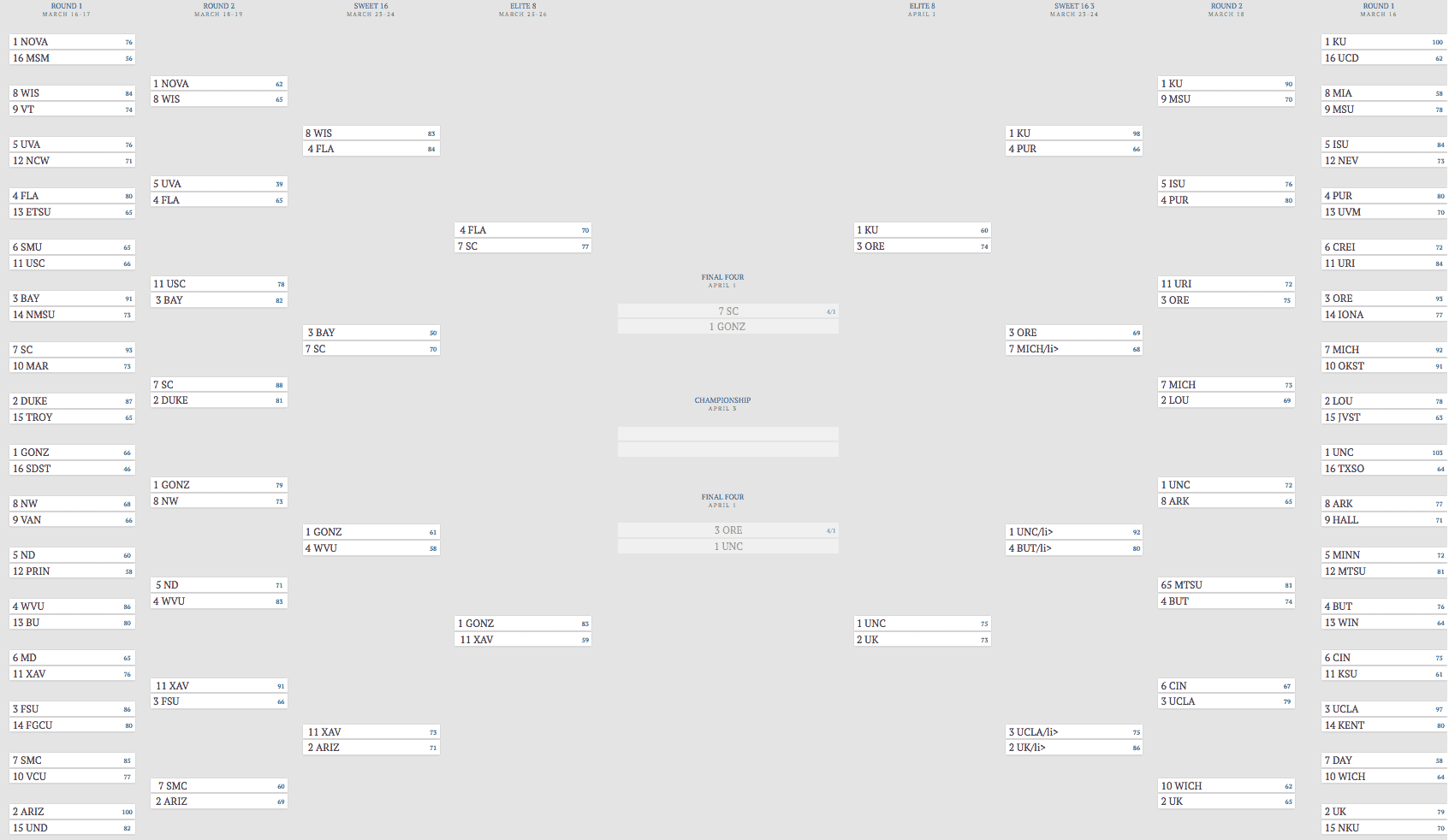 Round 1 March 16-17 1 NOVA 76 16 MSM 56 8 WIS 84 9 VT 74 5 UVA 76 12 NCW 71 4 FLA 80 13 ETSU 65 6 SMU 65 11 USC66 3 BAY 91 14 NMSU 73 7 SC 93 10 MAR 73 2 DUKE 87 15 TROY 65 1 GONZ 66 16 SDST 46 8 NW 68 9 VAN 66 5 ND 60 12 PRIN 58 4 WVU 86 13 BU 80 6 MD 65 ...